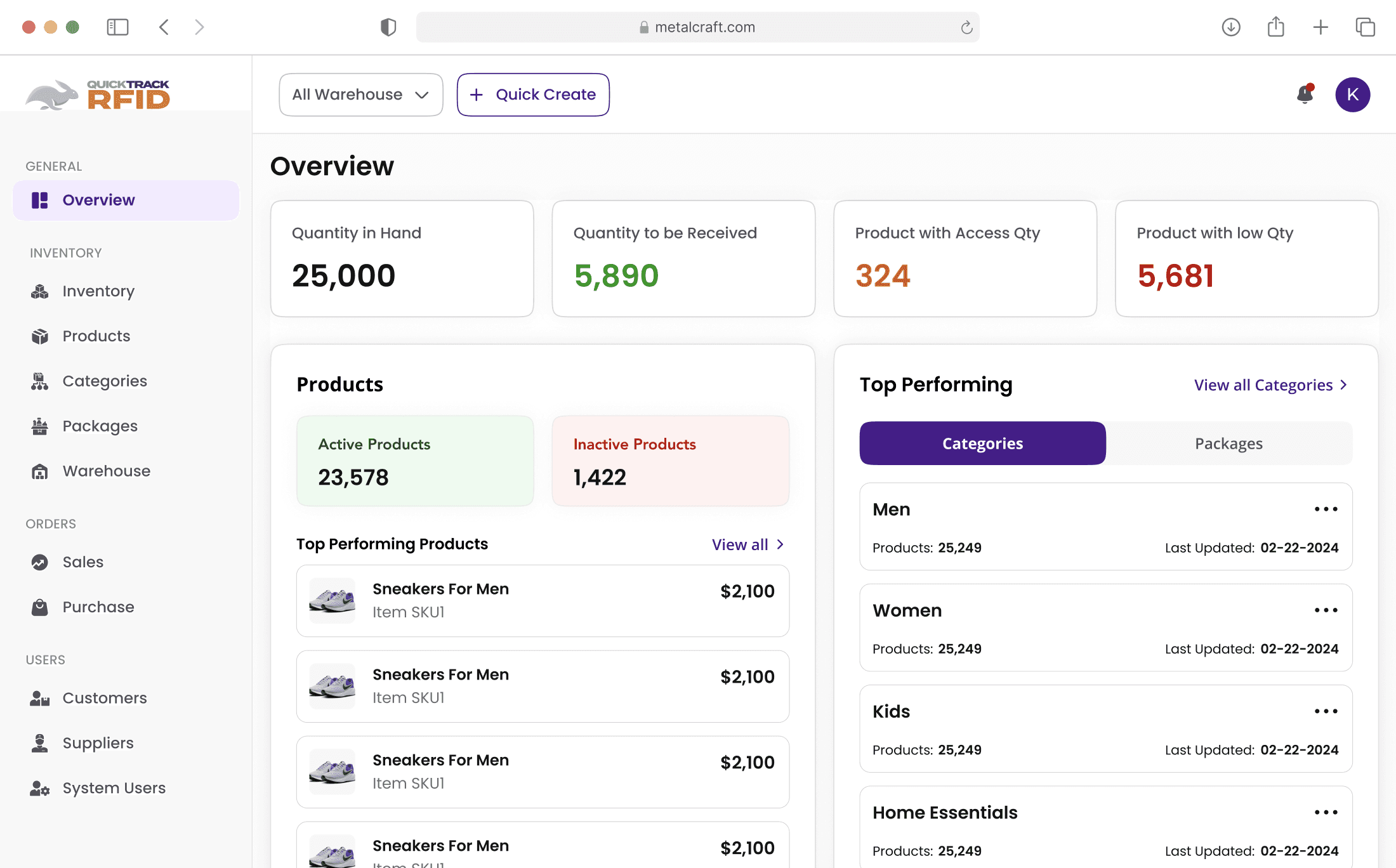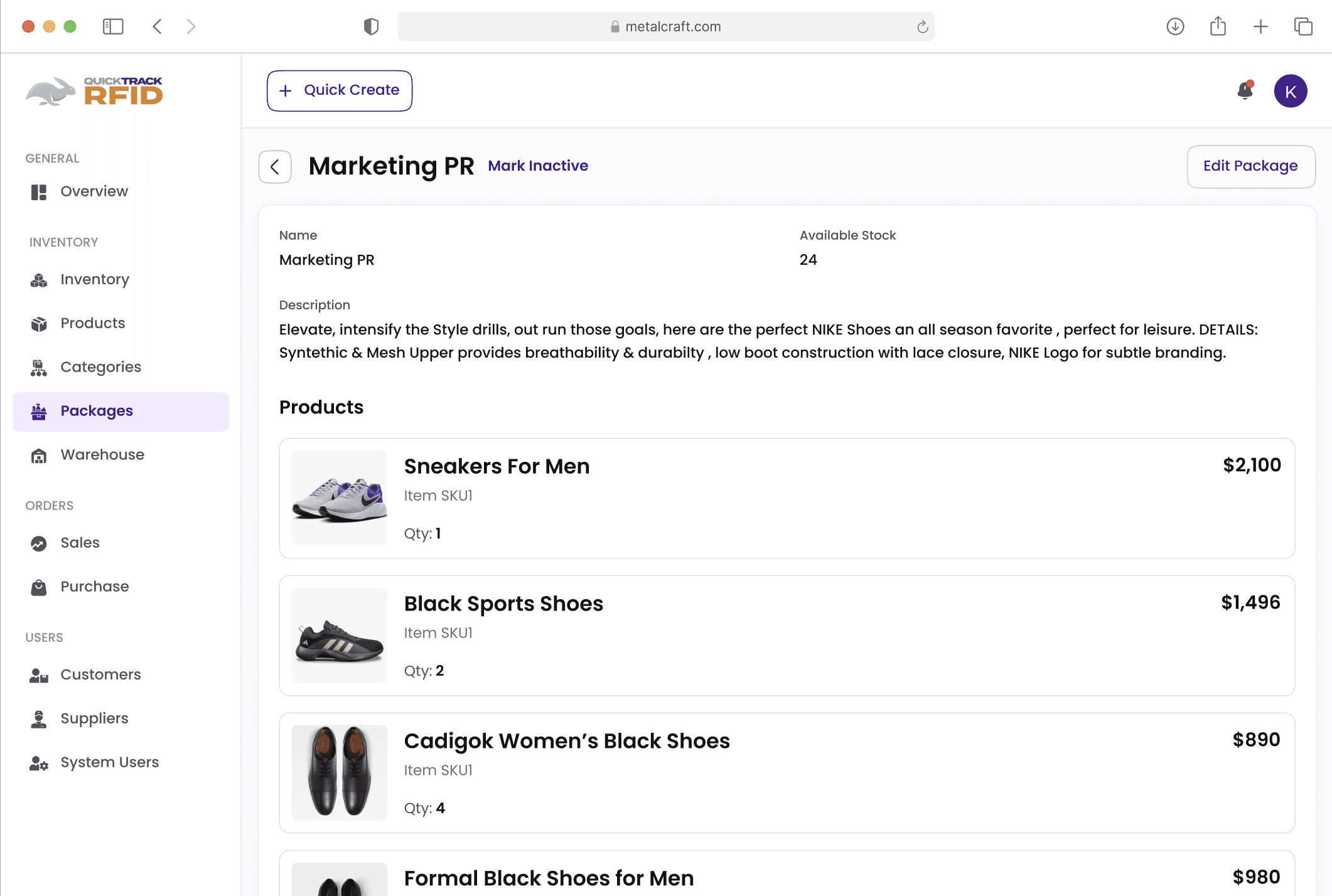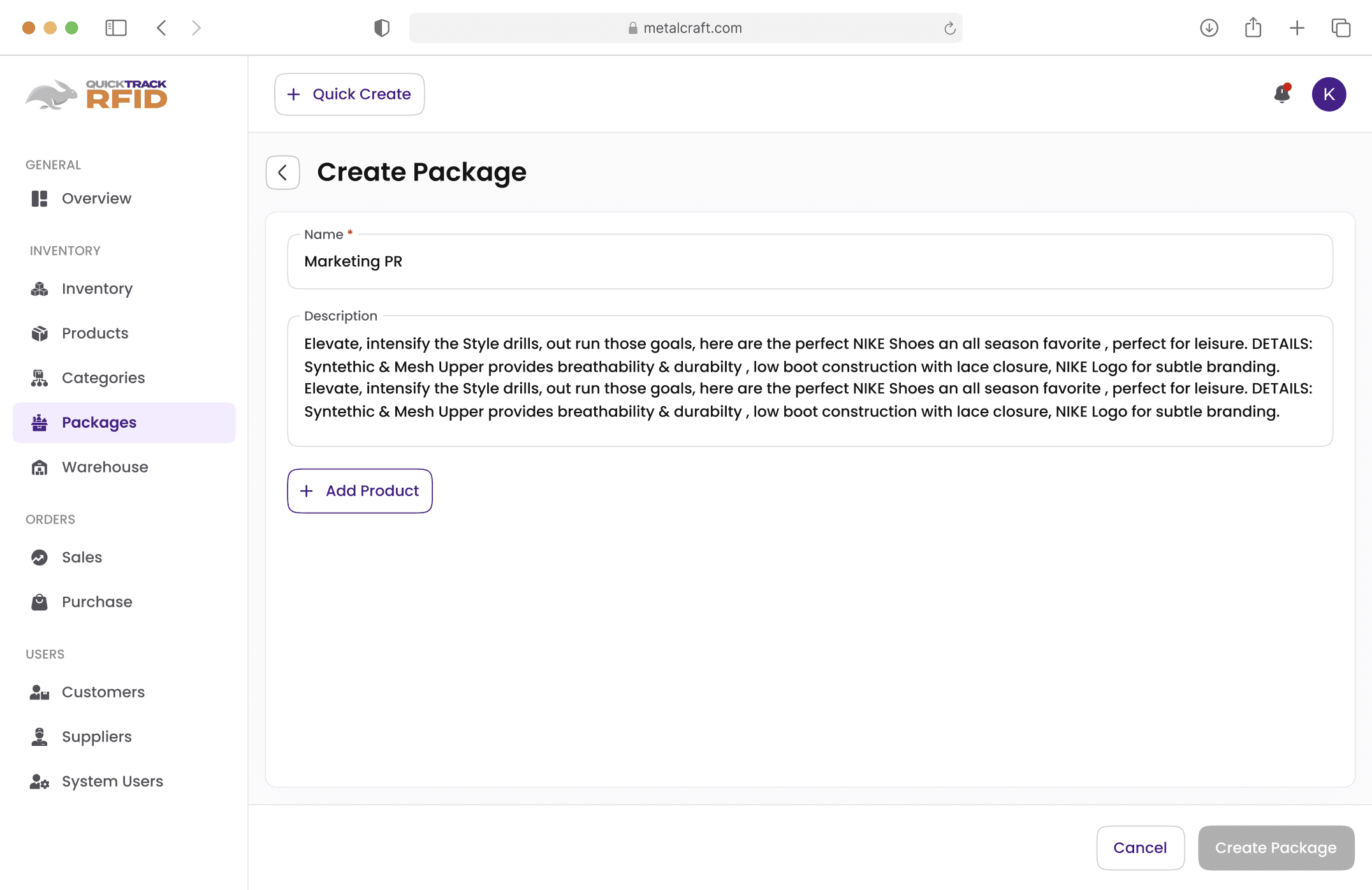 QuickTrack RFID is an inventory management portal that helps businesses track, organize, and manage their products across warehouses. To extend its capabilities, we introduced a Package Creation module — allowing admins to bundle multiple products into a single package, often at a discounted price. This not only made inventory management more flexible but also gave businesses a way to create attractive offers for their customers.