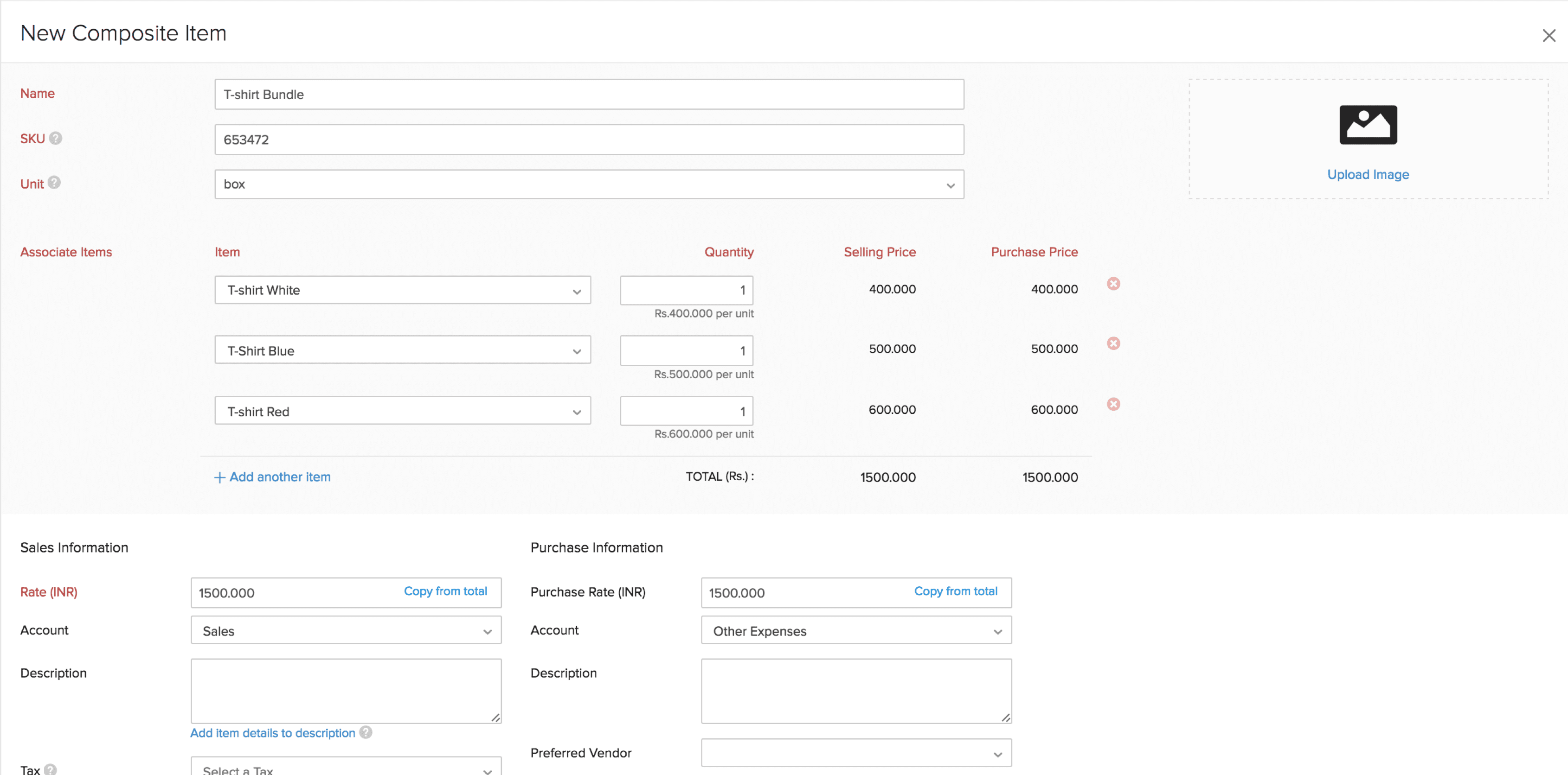 Zoho Inventory uses a typeahead search — when users click ‘Add Row’, they can start typing a product name or SKU, instantly see matching results, and add the product to the bundle.