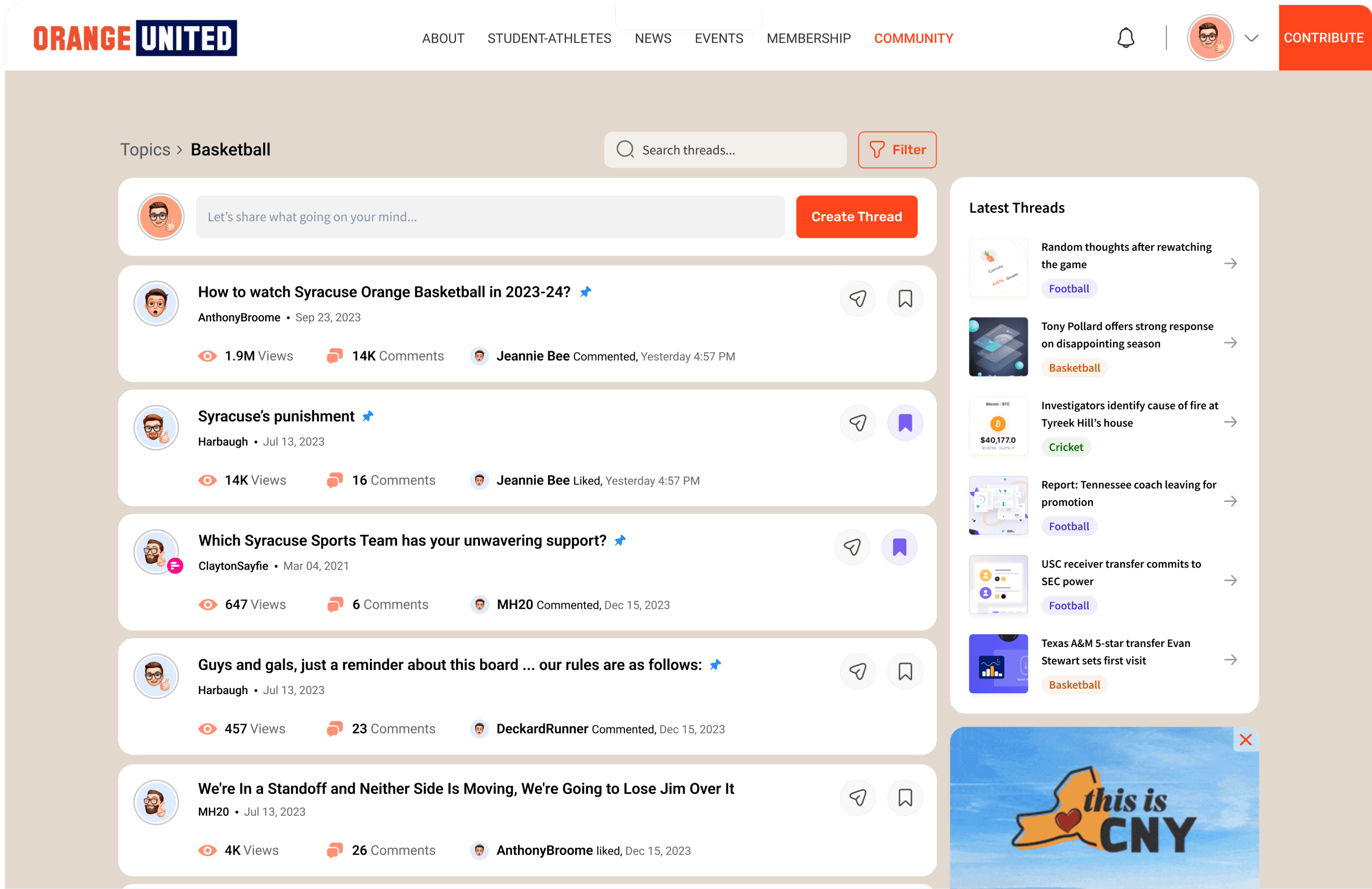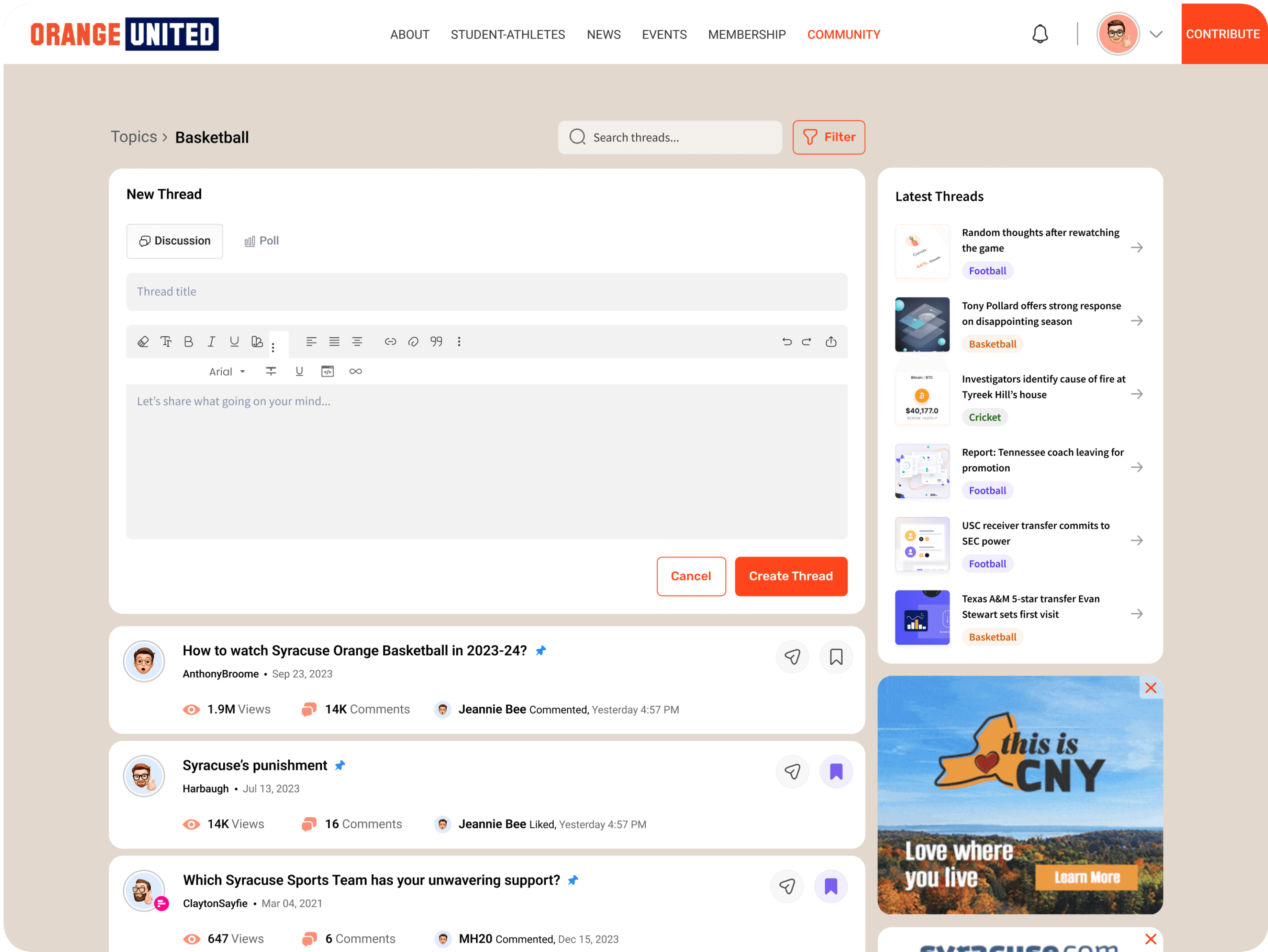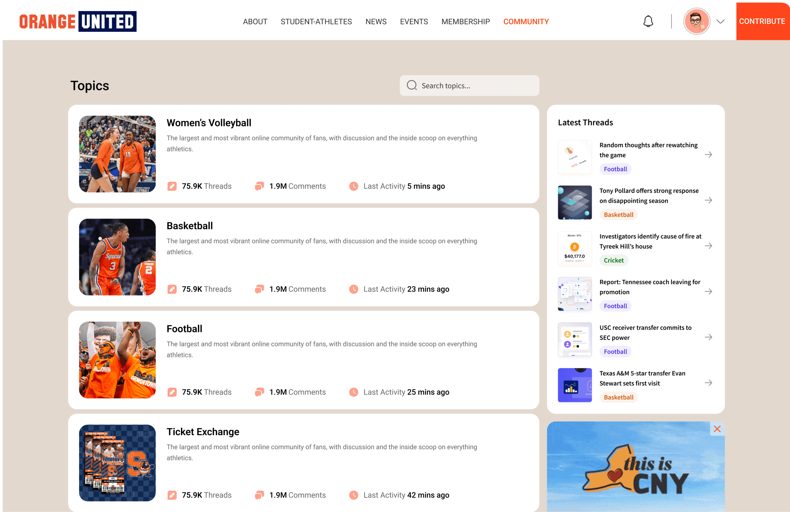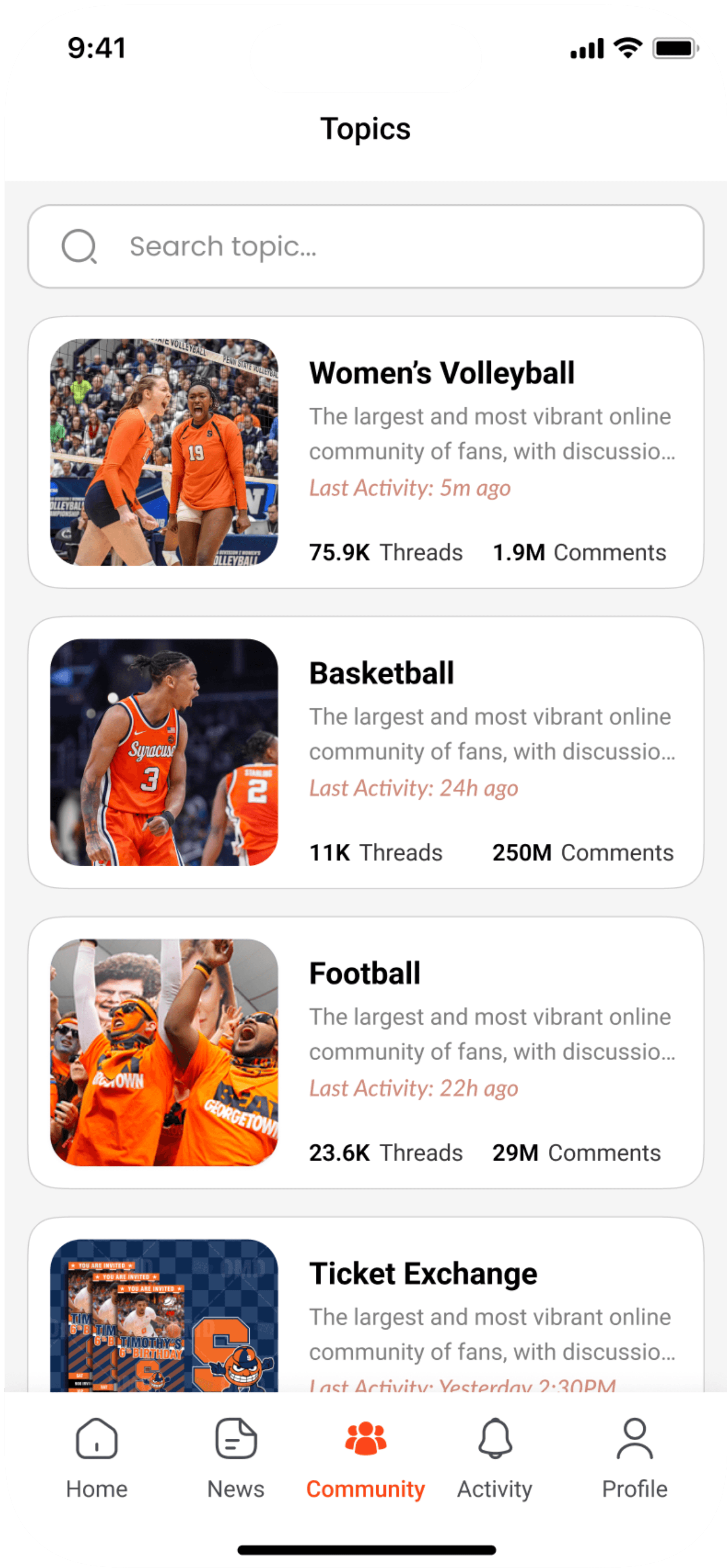 Introducing a "Community" feature, directly accessible from the top navigation, enabling fans to engage in discussions, share their passion for sports, and build connections within the Orange United community.