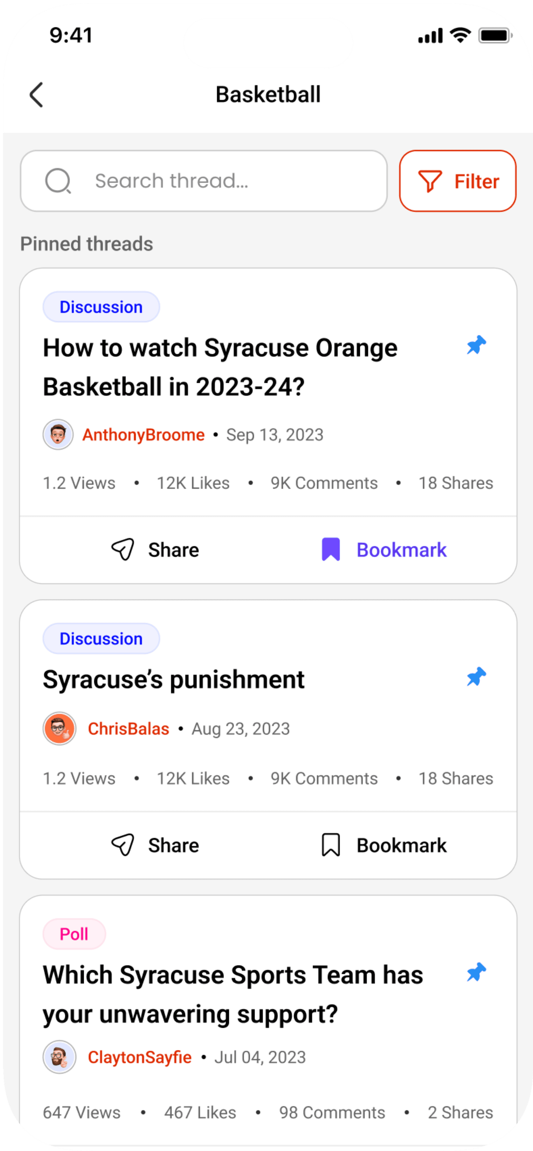 After selecting a topic of interest, users are taken to the threads listing page within the community. Here, they can view a list of threads related to the chosen topic. Each thread card provides detailed information, including number of views, comments, and more. Users also have the option to create a new thread, bookmark threads for later, and share them on other platforms.