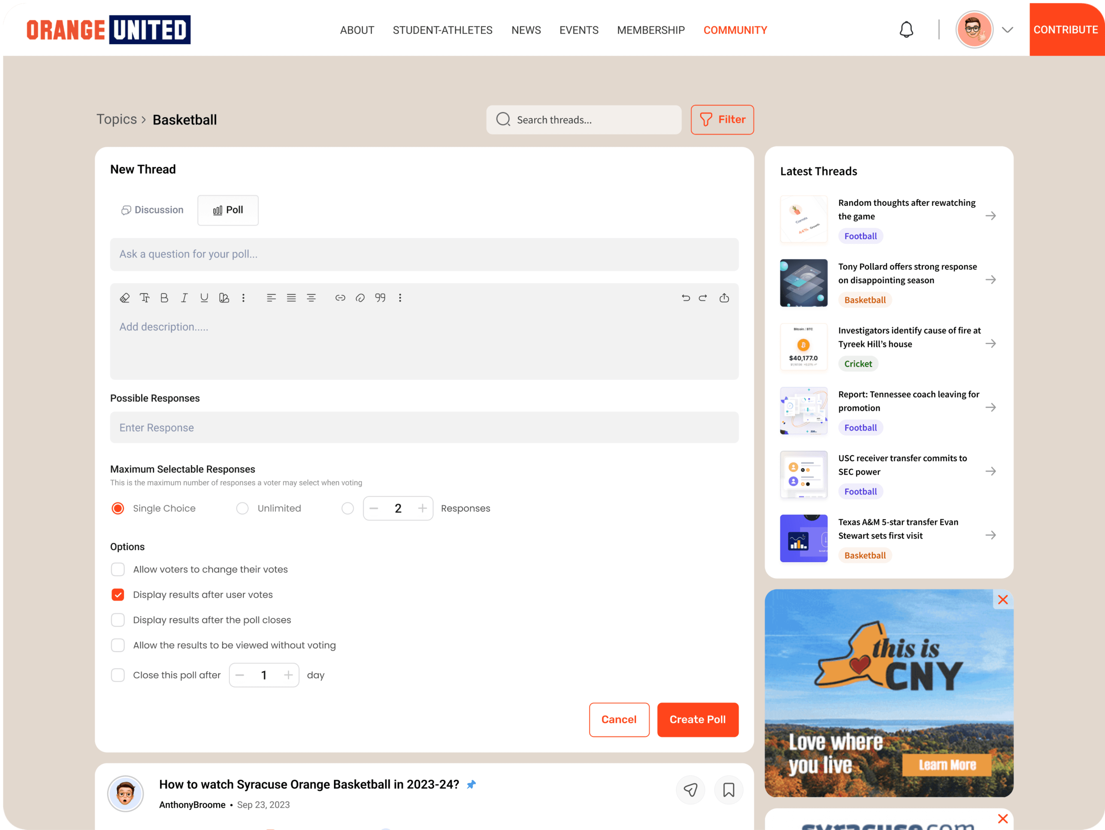 From the thread listing page, users can create two types of threads: discussions and polls.